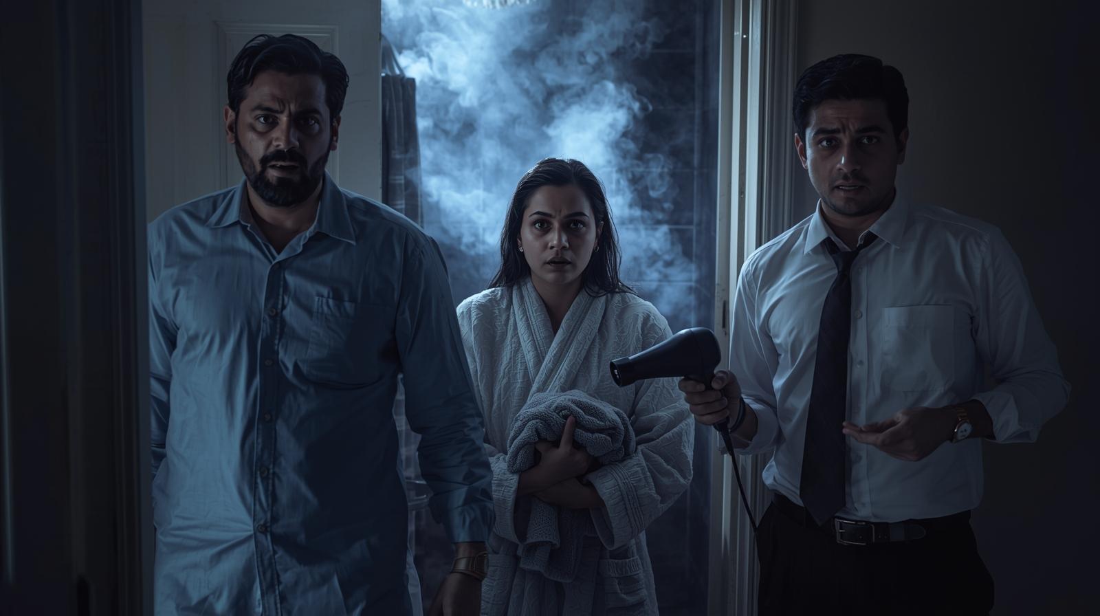 वह घर में घुस गया। बाथरूम के दरवाज़े के सामने अपरिचित जूते रखे थे। उसने दरवाज़ा खोला—प्रिया बाथरोब में थी, उसके बाल गीले थे, और सामने वाला आदमी हेयर ड्रायर पकड़े हुए था।