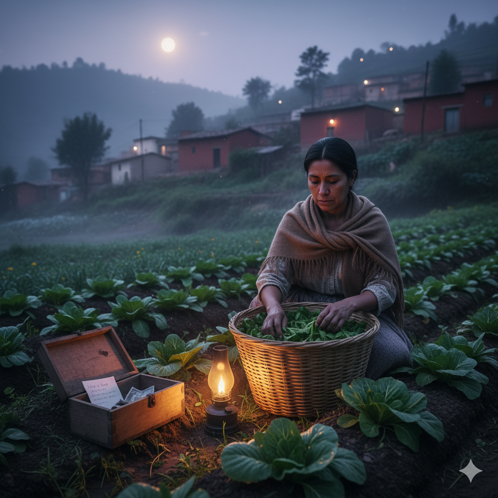 Cada día, Rosa se levantaba temprano, con su sombrero de ala ancha, iba al campo a cosechar verduras, cuidaba a los pequeños cerdos, todo para enviar dinero a Juan en la ciudad. El canto de los pájaros, el olor a tierra húmeda y sus suspiros se mezclaban con su silencioso esfuerzo.