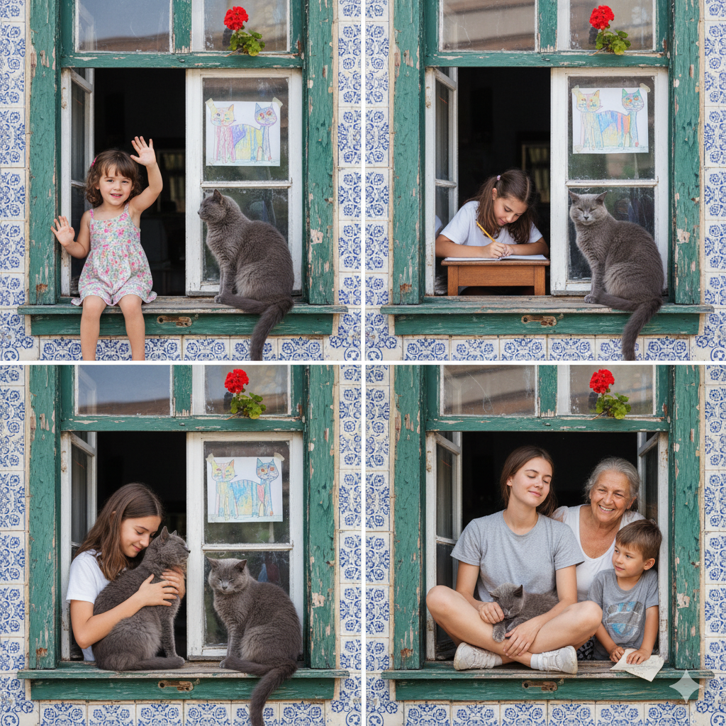 Desde ese día, la gata regresó todas las mañanas sin falta. La familia empezó a llamarla Nube, porque su pelaje, bajo el sol, parecía flotar. Nube se sentaba frente a la ventana mientras Lucía se acomodaba al otro lado del cristal. No hacían nada más. Solo se miraban. A veces Lucía dibujaba a Nube en sus hojas, con crayones gastados; otras, Nube levantaba una pata y tocaba el vidrio, como si quisiera acariciarla.