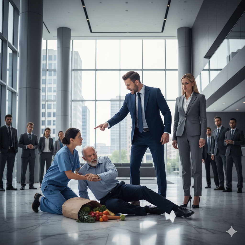 Emily dudó, recordó su entrevista y las advertencias de que un error podría costarle todo. Pero algo la impulsó. Se arrodilló y sostuvo al anciano: