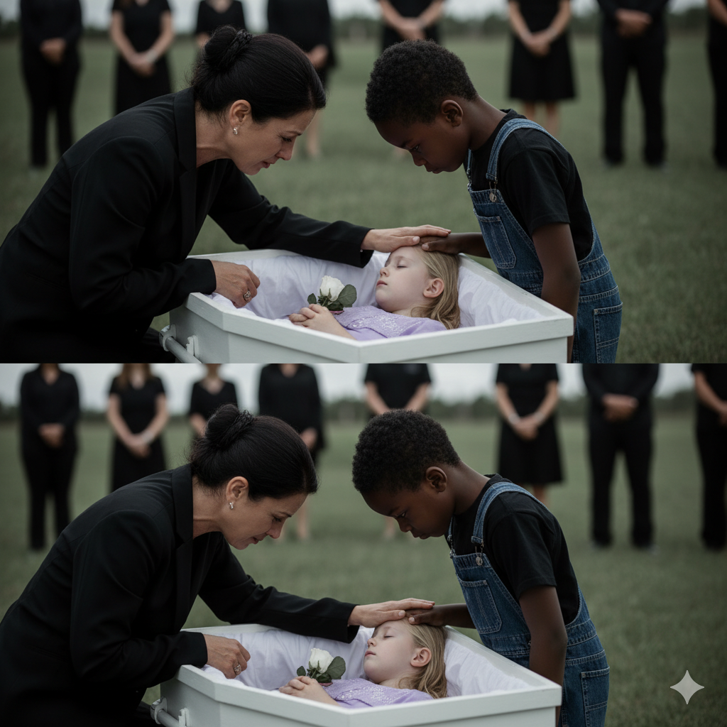Quería gritarle al chico, empujarlo, protegerse de otra herida. Pero su mano temblorosa finalmente descendió, sus dedos rozando la piel de su hija. El chico contuvo el aliento y en esa pausa insoportable, el funeral, que debía terminar con todo quedó suspendido al borde de algo que nadie podía haber imaginado.