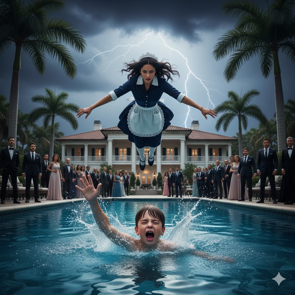 Los rayos iluminaban el cielo oscuro mientras el viento feroz sacudía las palmeras del lujoso complejo. Diego Mendoza, de apenas 7 años, había resbalado en el borde mojado de la piscina y ahora luchaba desesperadamente contra las olas artificiales que el sistema automático seguía generando sin piedad. El agua clorada se había vuelto turbia por la lluvia torrencial. Las ondas violentas empujaban al pequeño hacia el fondo una y otra vez.