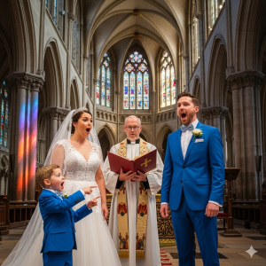 Pero la perfección es frágil. Bastó la voz temblorosa de un niño para que las máscaras cayeran y el lujo se transformara en un escenario de escándalo. Lucas Carter, de apenas ocho años, el hijo del novio, se levantó en el preciso instante en que el sacerdote pronunció las palabras solemnes: “Si alguien tiene un motivo para impedir esta unión, hable ahora o calle para siempre”.