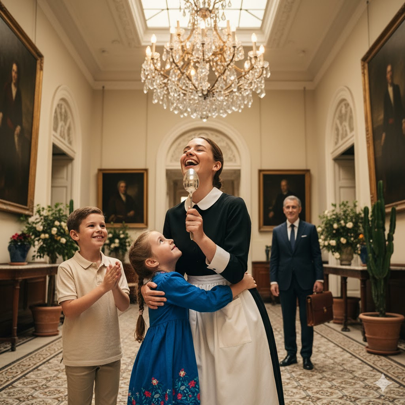 El tiempo pasó, y una noche Adrian volvió a ver una escena similar en el comedor. Ethan y Lily reían mientras mostraban a Rosa un baile gracioso que habían aprendido en la escuela. El candelabro de cristal iluminaba la habitación con luz dorada, las risas resonaban, y el corazón de Adrian se desbordaba de gratitud.