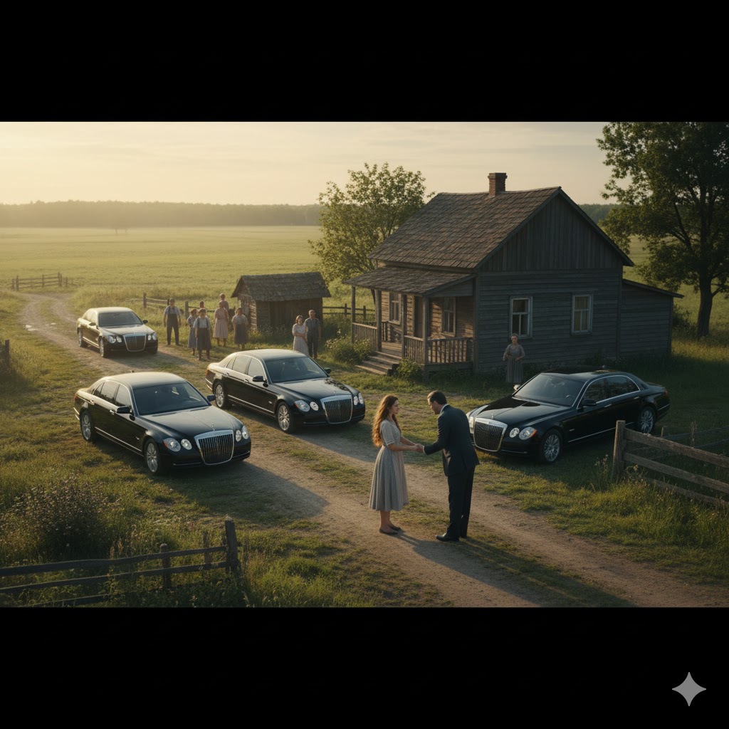 Hasta que una mañana, mientras reparaba una cerca, el rugido de varios motores rompió el silencio. Tres autos de lujo negros se detuvieron frente a su modesta granja. Todo el vecindario se reunió, murmurando incrédulo.