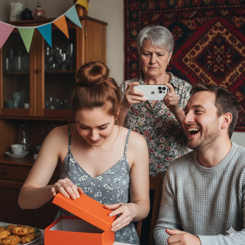 Mi marido estaba a mi lado riéndose a carcajadas, y mi suegra grababa mi reacción con su nuevo iPhone —el mismo que supuestamente debía estar dentro de esa caja.