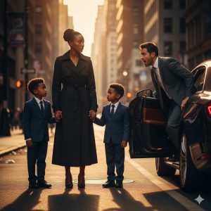 En el asiento trasero, dos pequeños niños vestidos con trajes azul marino idénticos miraban por la ventana con curiosidad y una fuerza silenciosa, igual que la de ella. Sus suaves manos apretaban las suyas con fuerza.