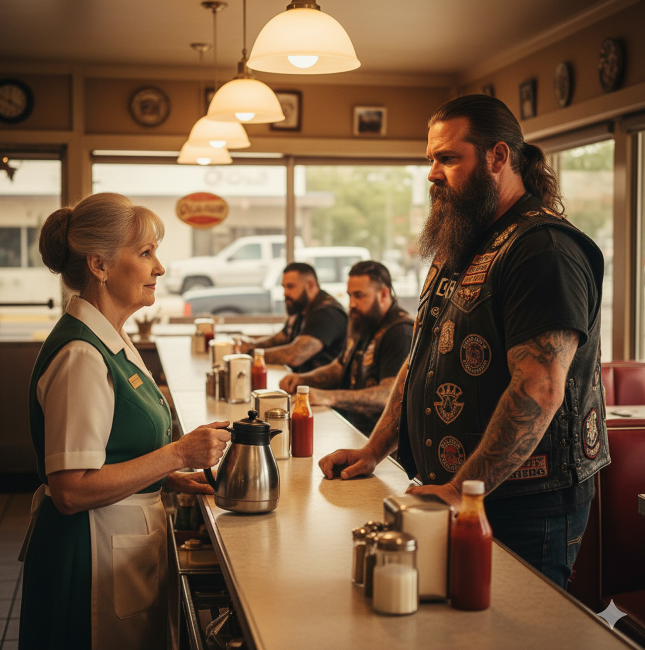 Las horas pasaron y la tormenta empeoró, golpeando las ventanas como una bestia furiosa. Los motociclistas se quedaron, contándole a Margaret parte de su historia: viajaban de estado en estado cuando la tormenta los atrapó desprevenidos. Con las carreteras cerradas y los moteles llenos, no tenían a dónde ir. Sus motos casi se habían congelado afuera, y sin refugio no habrían sobrevivido hasta la mañana.