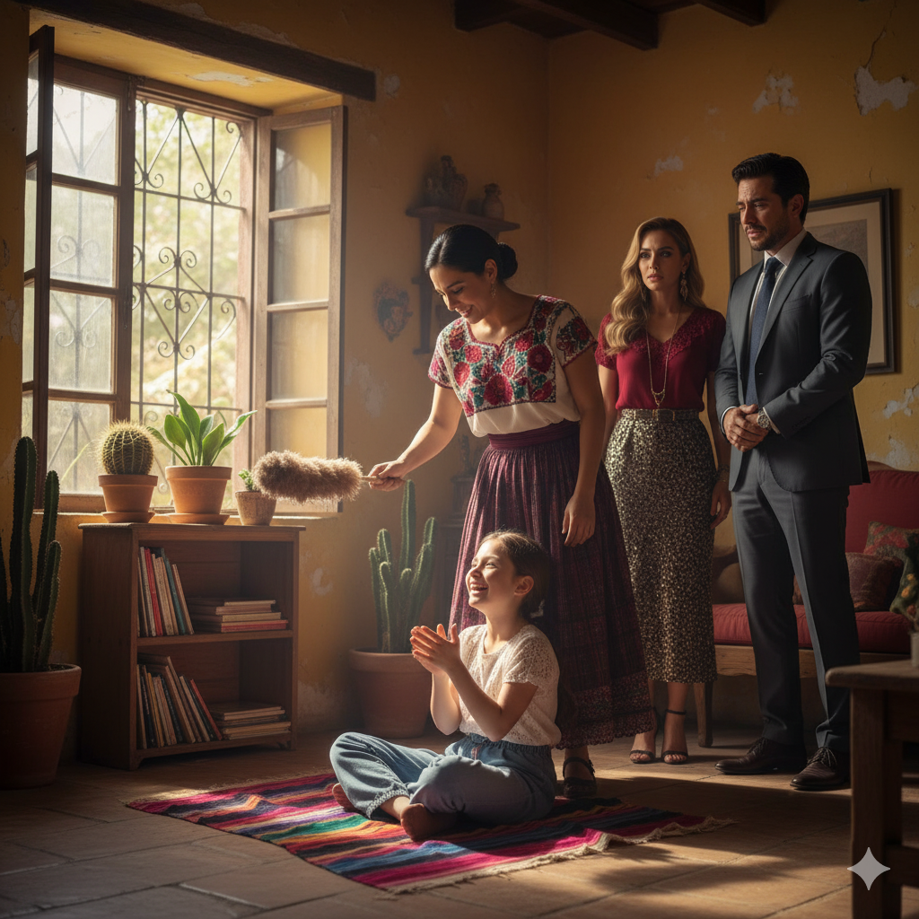 Lucía se detuvo. Tenía en la mano un trapo húmedo y en la otra un plumero viejo, desgastado, pero lleno de plumas coloridas.