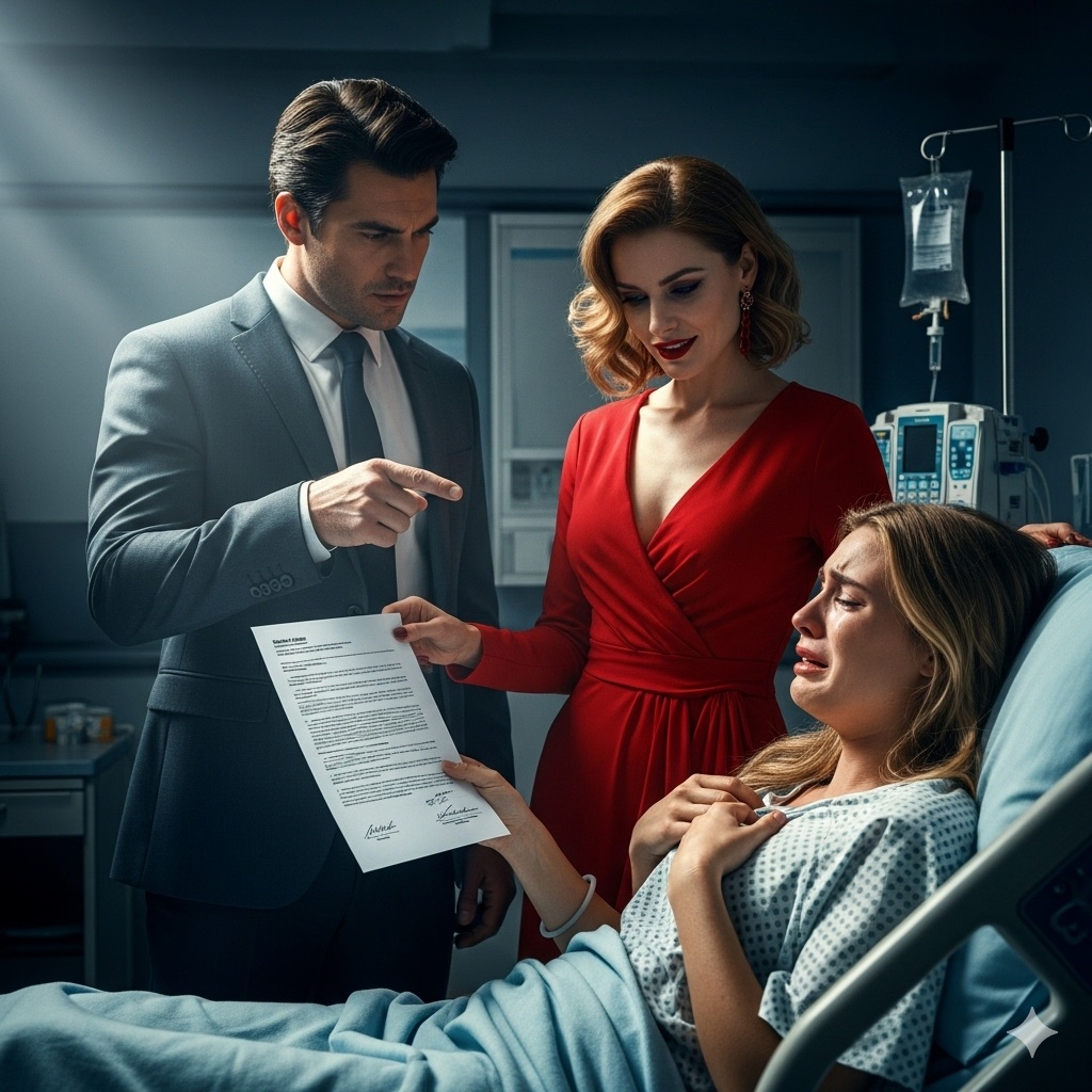 El olor antiséptico de la habitación del hospital se aferraba a la piel de Emily Carter mientras yacía recostada contra las rígidas almohadas blancas. Tubos y monitores la rodeaban, sus pitidos llenando el silencio con un ritmo constante. Aún se estaba recuperando de una cirugía tras un aborto espontáneo complicado, su cuerpo débil y su espíritu destrozado. Fue entonces cuando Daniel, su esposo de seis años, entró con una expresión fría y una carpeta manila en la mano.