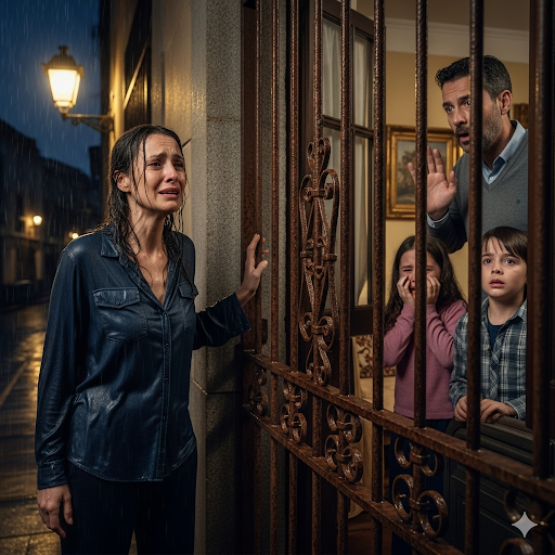 El portón de hierro, oxidado y pesado, chirrió. Una mujer delgada apareció bajo el aguacero: su abrigo empapado se pegaba a la piel, el cabello enmarañado goteaba sobre un rostro pálido, y en sus ojos brillaba un dolor insondable. Con manos temblorosas, se aferró a la reja.