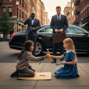 Al otro lado de la plaza había una niña de su edad. Su piel oscura brillaba de sudor, su ropa rota y sucia, sus pies descalzos polvorientos por el pavimento. En sus manos, agarraba una pequeña botella de cristal llena de un espeso líquido dorado. A pesar de su pobreza, los ojos de la niña mostraban determinación, como si guardara un tesoro.