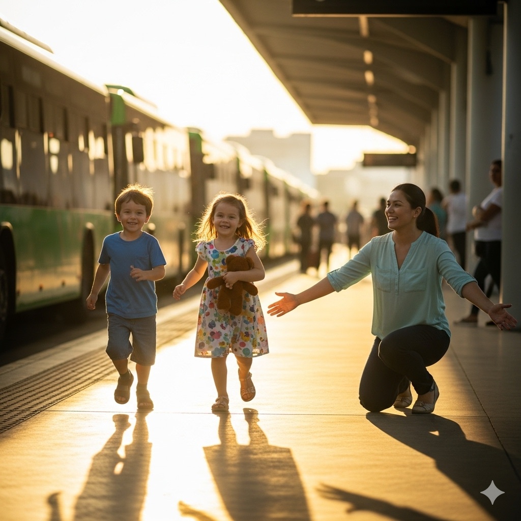 Pero justo cuando subía las escaleras del autobús, dos pequeñas figuras corrieron hacia ella llorando. Eran sus hijos —el niño de primaria y su hermanita— que se abrazaron a su madre y sollozaron con tanta fuerza que todo el pasillo quedó en silencio.
