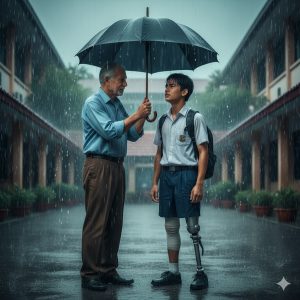 Incluso cuando Aman entró a la preparatoria —ahora a unos 5 kilómetros de distancia—, el Sr. Sharma siguió llevándolo en bicicleta de ida y vuelta. Temía que el niño se avergonzara de su pierna artificial, así que pidió personalmente a los maestros que lo dejaran sentarse en la primera fila, para que fuera más fácil de supervisar y menos expuesto a miradas fijas.