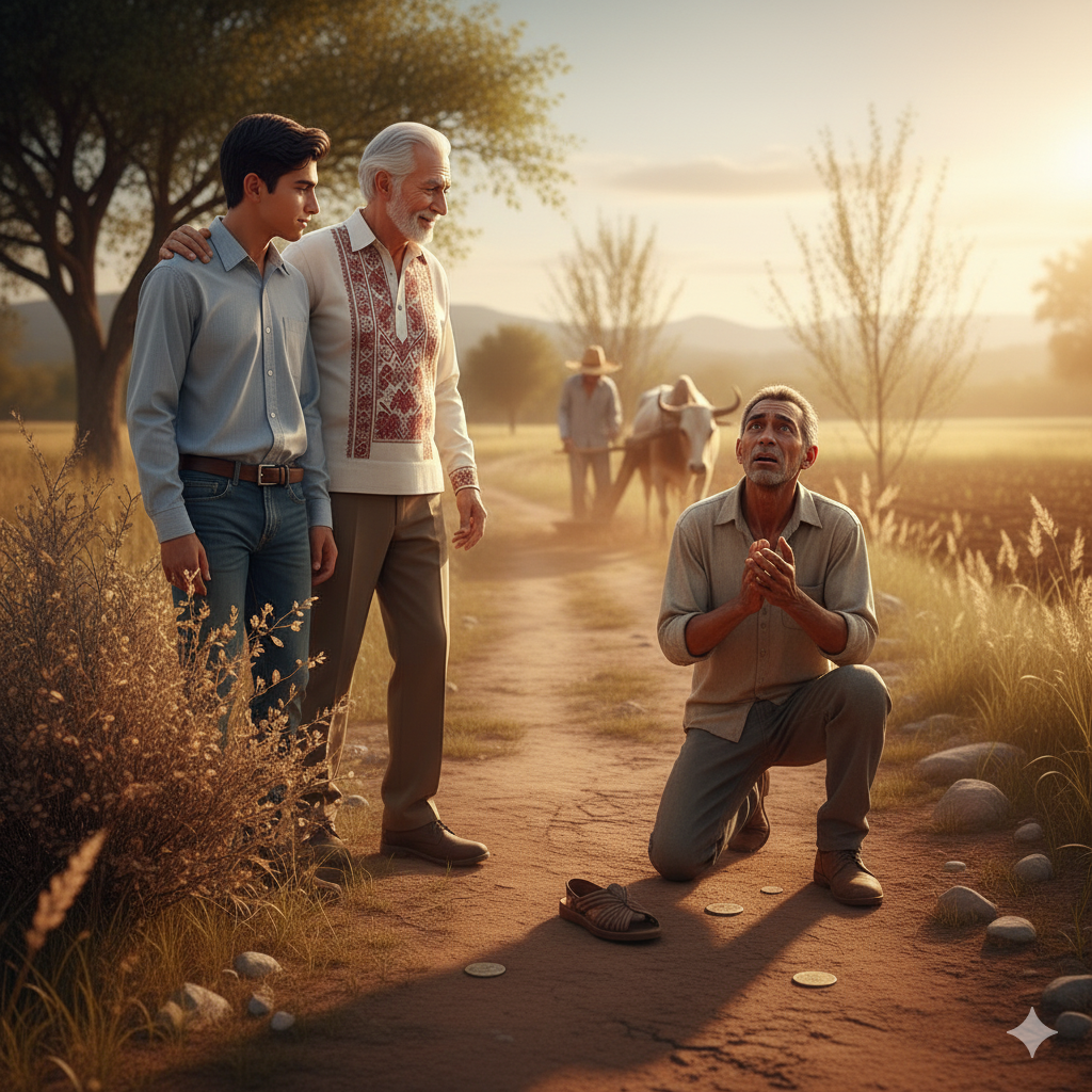De pronto, vieron un par de sandalias viejas, gastadas hasta el alma, abandonadas al borde del sendero. No muy lejos, un campesino, flaco y quemado por el sol, trabajaba la tierra con más fe que fuerza.