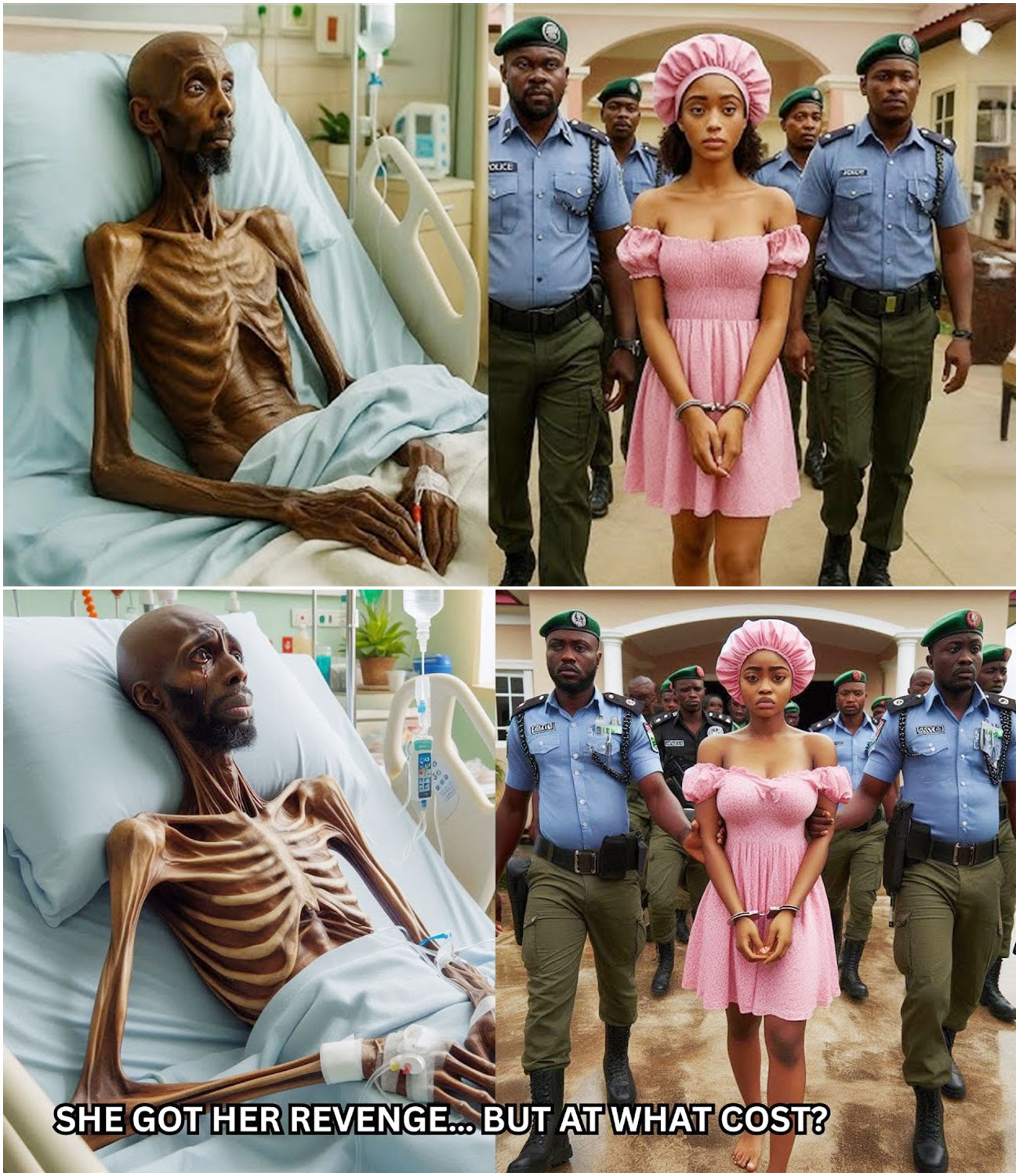 Con la voz temblorosa: «Está arrestada por transmitir el VIH al pastor John a sabiendas». El oficial sacó unas esposas. Amaka se congeló. Las palabras la golpearon como un puñetazo. «¿Qué? ¿Transmitir el VIH? ¿De qué está hablando?». El segundo oficial se adelantó. «Tenemos una queja del pastor JN». Afirma que lo infectó deliberadamente. «No es cierto, no lo hice». Amaka tartamudeó, dándole vueltas a la cabeza. El primer oficial no esperó su explicación. «Puede explicarlo en la comisaría», dijo fríamente. Los vecinos comenzaron a reunirse. Susurraban entre ellos: «¿Qué está pasando?». Una mujer preguntó: «¿Esa no es Amaka? ¿Por qué la arrestan?». Otra murmuró: «Aaka miró a su alrededor con el rostro ardiendo de vergüenza». «Por favor, déjeme agarrar mis zapatillas», suplicó. Los oficiales la ignoraron y la llevaron a la camioneta policial que la esperaba. Luchó por mantener el equilibrio mientras los murmullos de la multitud se hacían más fuertes en la comisaría. Aaka se sentó en la sala de interrogatorios, con las manos aún esposadas. Un oficial superior entró con un expediente y se sentó frente a ella. Okafor, empezó a ajustarse las gafas. Pastor.