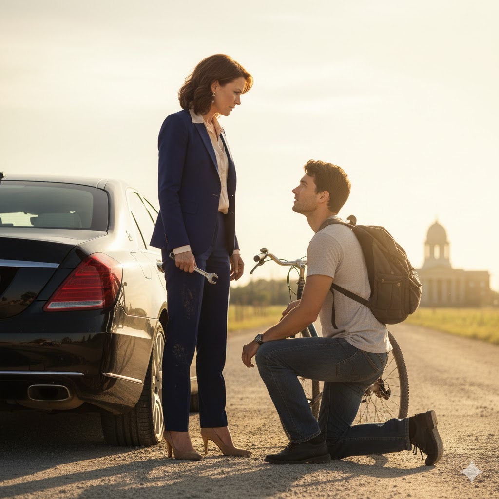 La mujer, vestida con un traje elegante ahora manchado de polvo, suspiró con frustración mientras miraba el neumático desinflado de su coche.