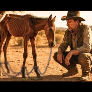 Y como si la crueldad no fuera suficiente, clavado en el árbol había un cartel de madera quemada que decía con letras toscas: “Potro, inútil, que se muera aquí.” Los ojos del pequeño animal, vidriosos por la deshidratación, miraron a Siik con una súplica silenciosa que atravesó el alma del vaquero como una bala. El potro intentó levantarse al ver al hombre, pero las cadenas lo mantuvieron postrado y un gemido ahogado escapó de su garganta reseca.