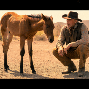 Y como si la crueldad no fuera suficiente, clavado en el árbol había un cartel de madera quemada que decía con letras toscas: “Potro, inútil, que se muera aquí.” Los ojos del pequeño animal, vidriosos por la deshidratación, miraron a Siik con una súplica silenciosa que atravesó el alma del vaquero como una bala. El potro intentó levantarse al ver al hombre, pero las cadenas lo mantuvieron postrado y un gemido ahogado escapó de su garganta reseca.