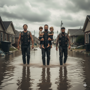 Pero los verdaderos héroes ya estaban allí, sus parches de Hells Angels empapados y pesados, sus  motocicletas abandonadas en la carretera mientras luchaban contra el tiempo y la corriente para alcanzar a esos bebés atrapados en esa trampa mortal amarilla.
