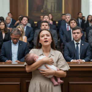 El eco de un llanto infantil quebró el silencio solemne del tribunal. Todos los presentes giraron la cabeza al mismo tiempo, buscando el origen de aquel sonido que parecía venir de un lugar imposible, el corazón de una madre desesperada. Frente a ellos, una mujer joven de rostro pálido y vestido gastado sostenía a un bebé contra su pecho.