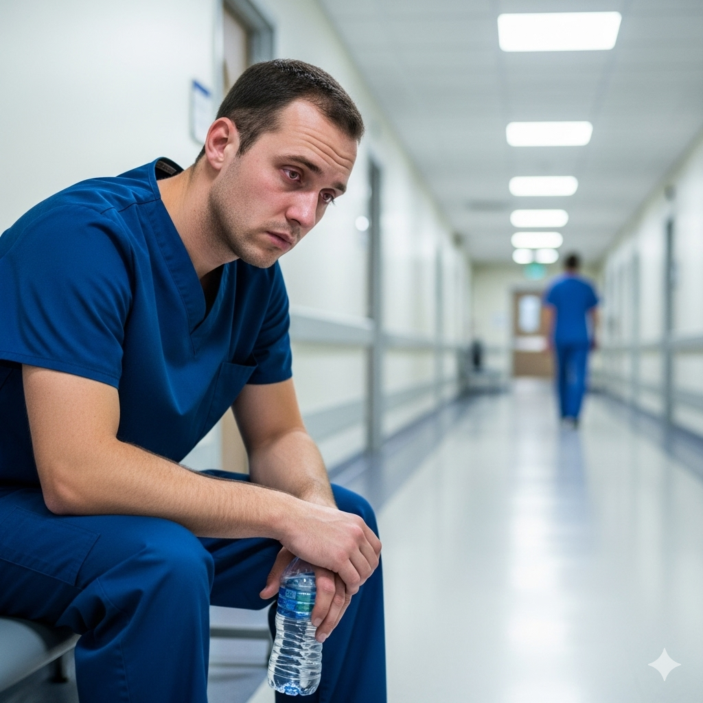 Marco llegó a la sala de descanso. Se dejó caer en la silla de madera, la espalda encorvada, las manos entrelazadas. Nadie lo notó. Todos estaban ocupados: pasos apresurados, voces llamándose, monitores que pitaban sin cesar. Miró el reloj: las agujas avanzaban, pero para él el tiempo parecía detenido. Y se preguntó: “¿Qué sentido tiene todo? El día que yo me derrumbe, ¿habrá alguien que me pregunte: Marco, ¿estás bien?”