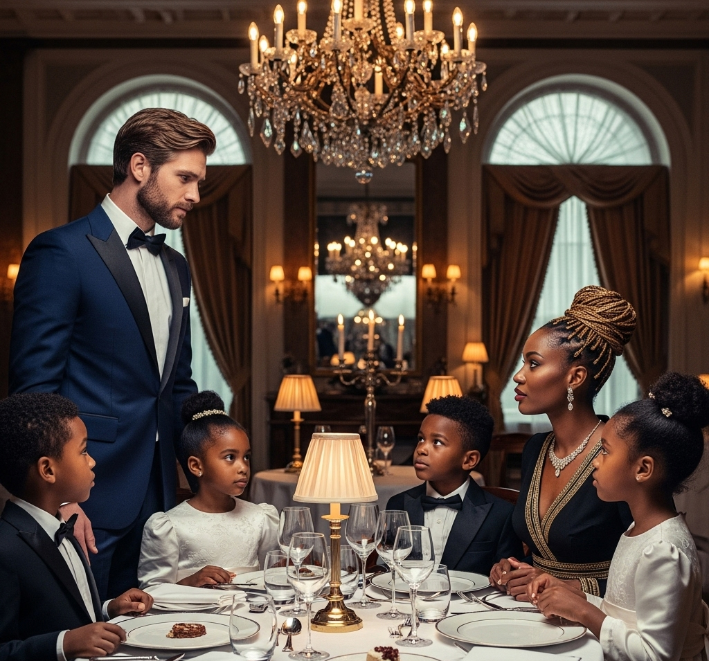 Su piel de ébano brillaba bajo la luz tenue del restaurante y su sonrisa —esa sonrisa que una vez fue solo para él— ahora iluminaba el rostro de tres pequeños que no podían tener más de cuatro años.