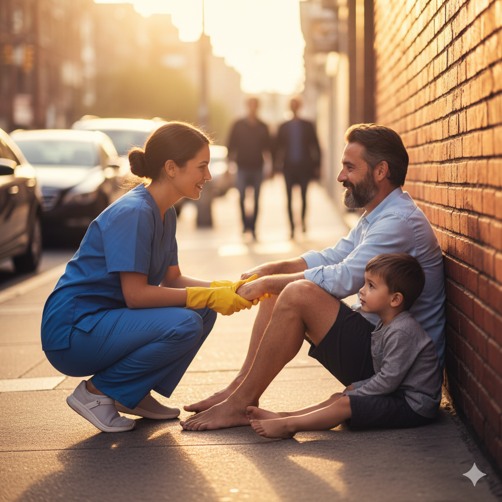 Ilang tao ang naghahagis ng barya sa kanila nang hindi nakatingin, ang iba naman ay nagkukunwaring hindi sila nakikita.Nalulungkot na si Mateo kapag may babaeng nakatayo sa harap nila. Siya ay bata pa sa kanyang kalagitnaan ng twenties, nakasuot ng asul na uniporme sa paglilinis at nakasuot ng sapatos na pang-tennis. Pagod na pagod ang kanyang mukha, ngunit malambot ang kanyang mga mata.