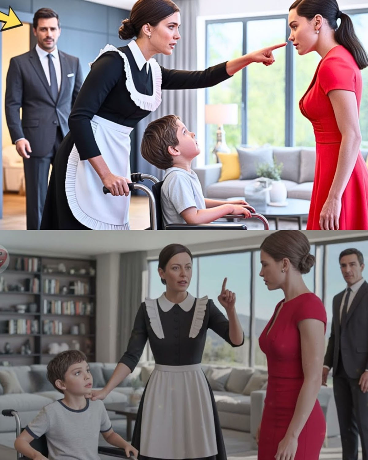 El niño en silla de ruedas de 7 años intentaba contener el llanto mientras su madrastra lo humillaba sin piedad. Pero antes de que ella dijera algo peor, la empleada doméstica apareció en la puerta y gritó, “¡No hagas eso.” La voz resonó por toda la sala. El millonario, que acababa de llegar, quedó paralizado al ver la escena.
