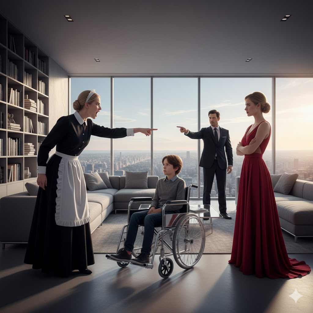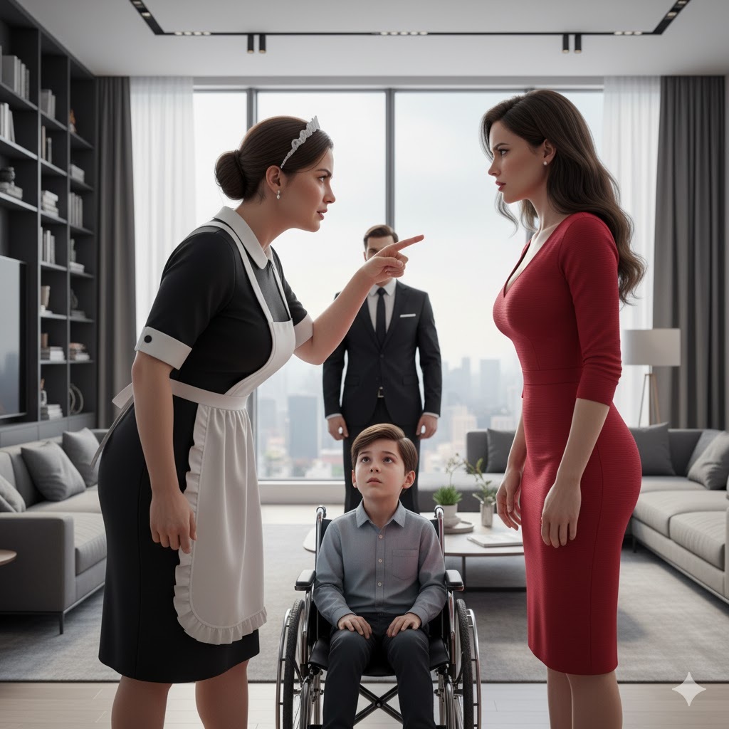 El niño en silla de ruedas de 7 años intentaba contener el llanto mientras su madrastra lo humillaba sin piedad. Pero antes de que ella dijera algo peor, la empleada doméstica apareció en la puerta y gritó, “¡No hagas eso.” La voz resonó por toda la sala. El millonario, que acababa de llegar, quedó paralizado al ver la escena.