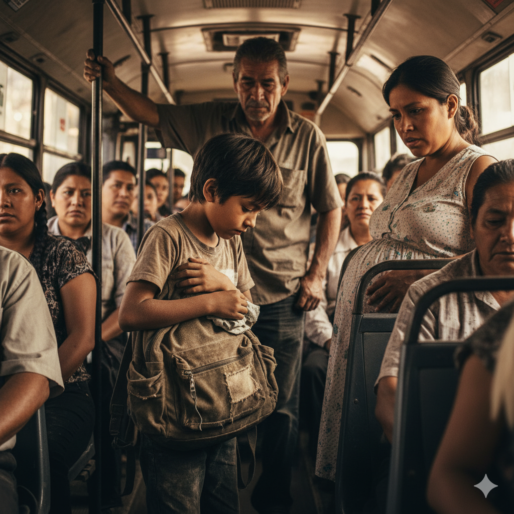 Entre ellos, subieron un niño con la ropa sucia y una mochila gastada en la espalda, y un hombre de rostro cansado, tal vez obrero también. Alguien bajó y el niño tomó su lugar; el hombre quedó de pie a su lado.