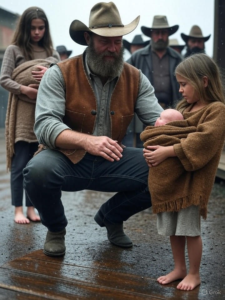 Nos puede comprar, señor”, dijo la niña pequeña sosteniendo a un bebé. El vaquero solitario miró el rostro de la mujer…