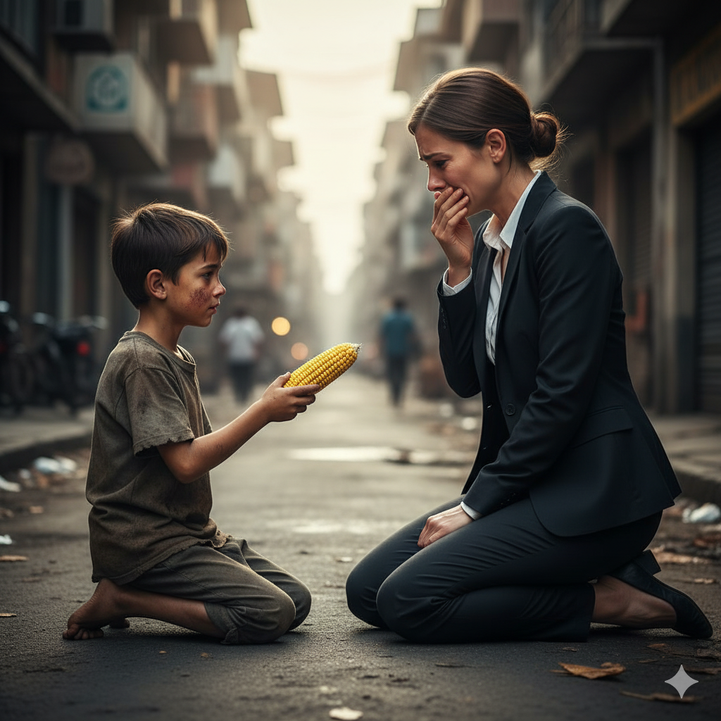 PEQUEÑO MENDIGO OFRECE SU ÚNICO MAÍZ A UNA MILLONARIA QUE LLORABA EN LA ACERA, Y LO QUE ELLA DIJO…