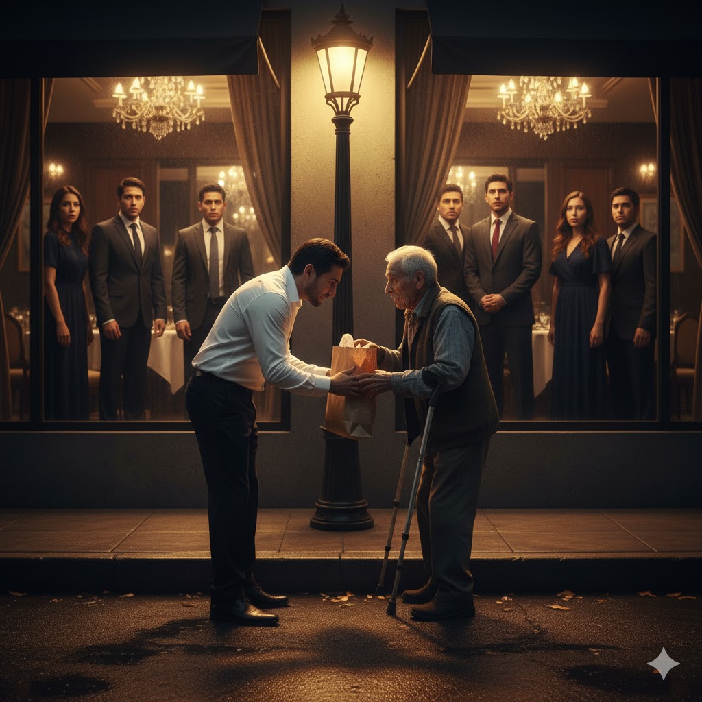 un hombre joven, vestido con camisa blanca y pantalón oscuro, entregando una bolsa de comida a un anciano frente a un restaurante elegante.