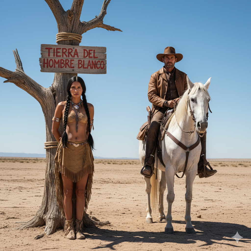 Ranchero silencioso, encontró una joven comanche colgada de un árbol con un letrero que decía Tierra del Hombre Blanco. El sol quemaba sin piedad sobre la frontera polvorienta entre Chihuahua y Sonora. Era mediodía y el viento del norte traía consigo ráfagas de arena que raspaban la piel como cuchillos diminutos.
