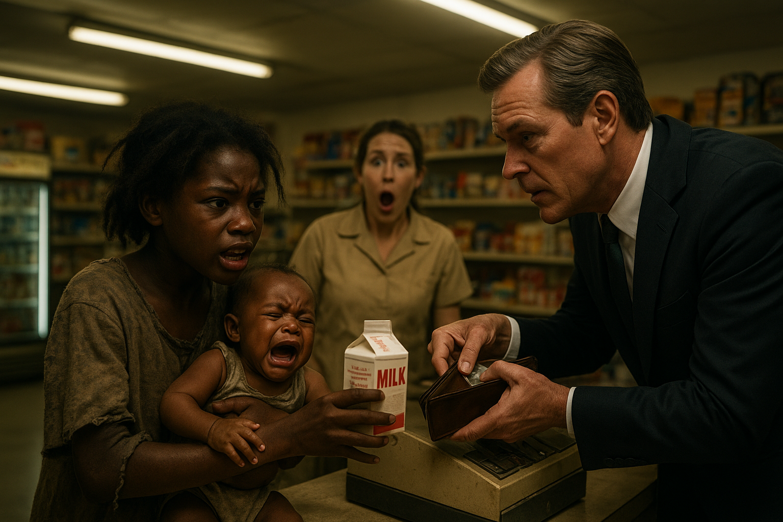 Los labios de Amara temblaron mientras agarraba la leche con más fuerza. “Por favor, te lo pagaré algún día. Mi hermano tiene hambre. No ha comido desde anoche”. Su voz se quebró, pero sus ojos ardían con determinación.