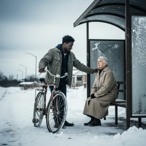 Era un pequeño pueblo al final de un invierno implacable, donde el frío aún mordía las calles y el viento silbaba entre las casas. La nieve cubría las aceras y el cielo gris parecía reflejar la dureza de la estación. En medio de esa quietud helada, un joven de 18 años, negro y huérfano, pedaleaba con esfuerzo en su vieja bicicleta. Era lo único que le quedaba de su madre fallecida, y con ella, su esperanza de sobrevivir un día más.