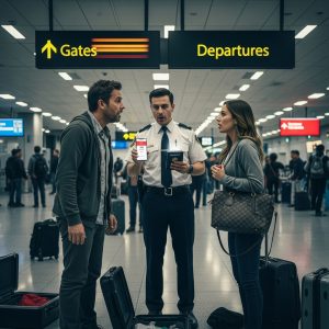 — “Disculpe, la tarjeta de crédito usada para reservar los boletos muestra signos de fraude. Necesitamos que ambas personas lo acompañen a una oficina para verificar.”