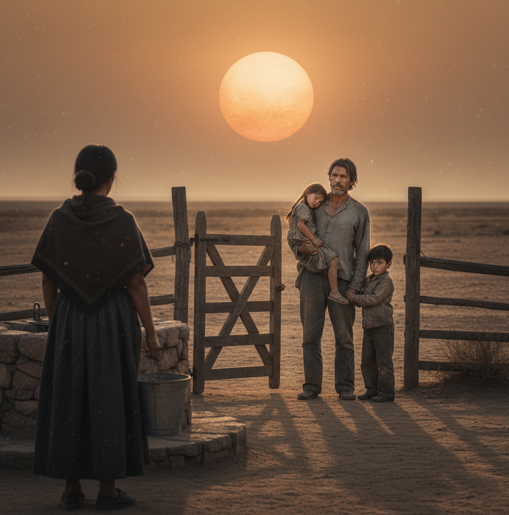 Carmen alzó la vista. En el umbral, con la piel tostada y los ojos hundidos por el camino, estaba un hombre cargando a una niña con trenzas deshechas; a su costado, un niño de mirada seria se aferraba a su pantalón. Ropa de manta gris, botas cansadas, polvo en la ceja y el labio: el desierto dibuja su propia cartografía sobre los cuerpos.