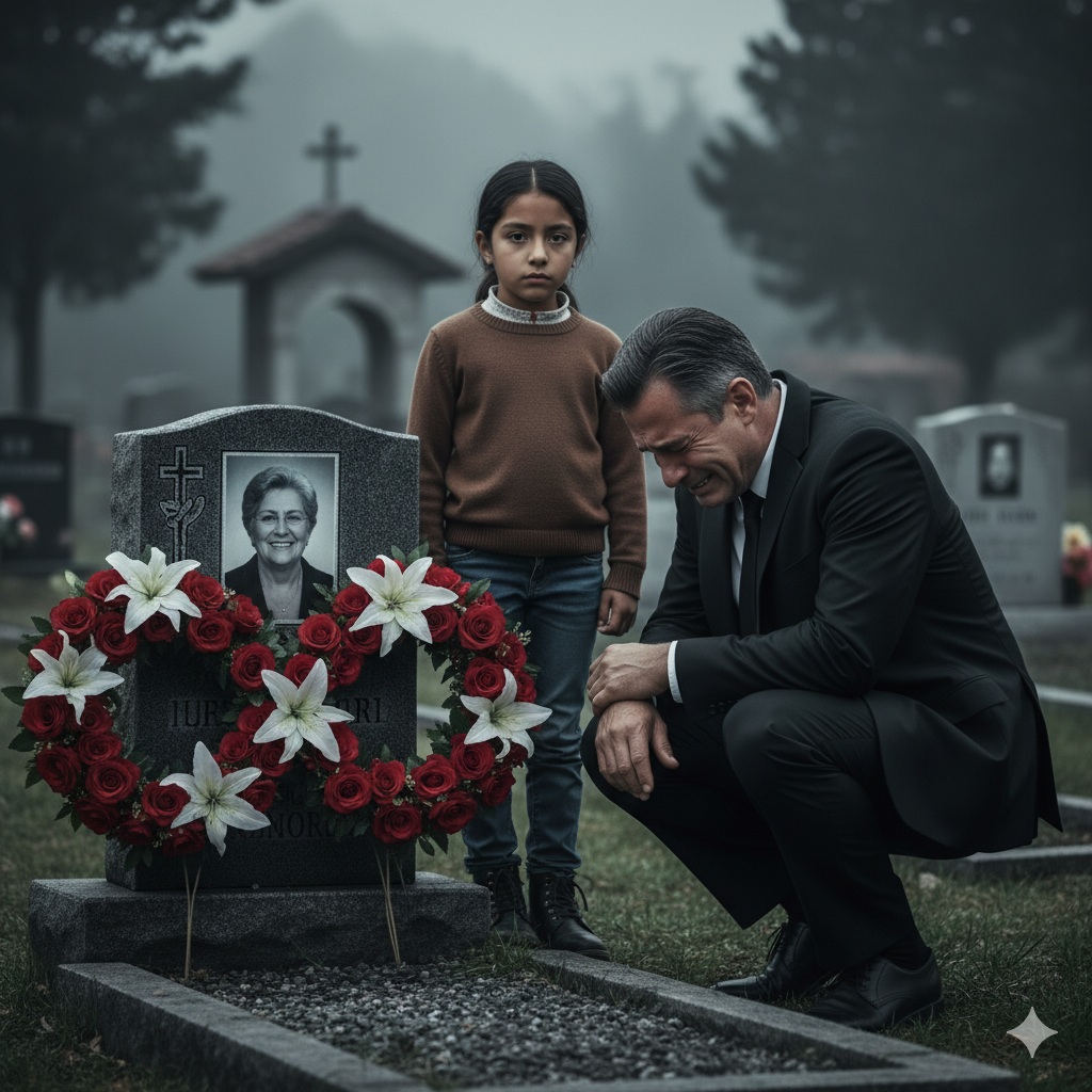Pero, para su sorpresa, la muchacha no lo tomó. En cambio, levantó la mirada hacia la lápida y, con una voz clara, dijo: — “Tu esposa… sigue viva.” Alejandro quedó paralizado. Aquellas palabras cayeron como un rayo en el silencioso panteón. — “¿Qué dijiste?” —preguntó con la voz temblorosa. La joven simplemente negó con la cabeza, dio media vuelta y se alejó rápidamente entre los cipreses. Alejandro corrió tras ella, pero ya había desaparecido. El viento soplaba entre las tumbas mientras el ramo de flores caía al suelo. Y por primera vez en tres años, una duda terrible se apoderó de su corazón.