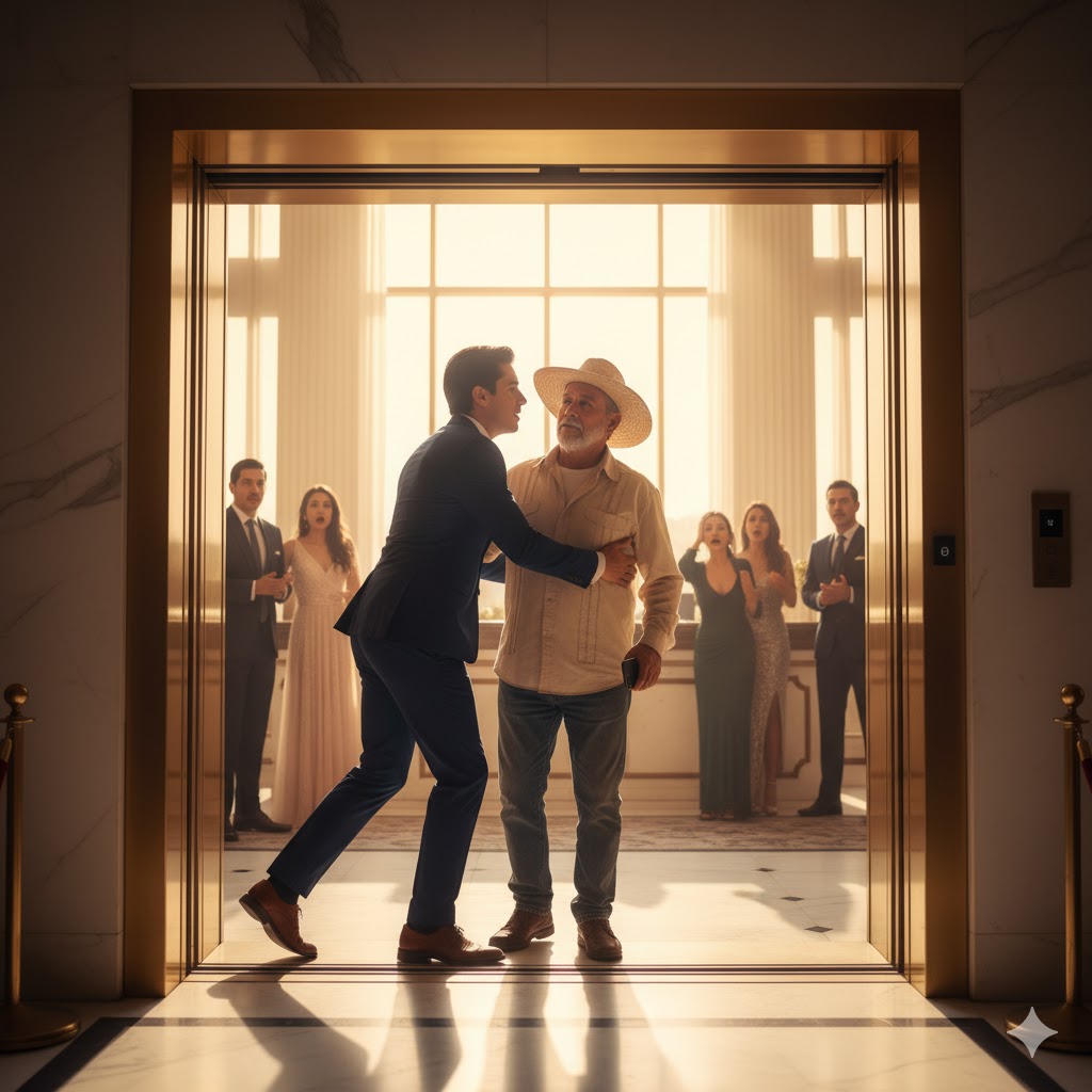 De allí salió un hombre joven, trajeado, con cara de sorpresa. Caminó directo hacia el campesino, y antes de que alguien entendiera lo que pasaba, lo abrazó con respeto.