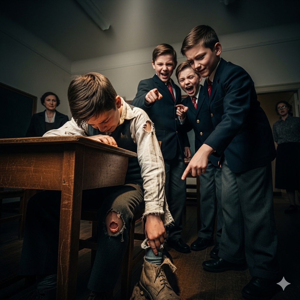 —¡Ey, miren los zapatos de payaso de Malik! —gritó uno, y la clase estalló en risas. Unas chicas se taparon la boca, susurrando. Malik intentó ignorarlo, mirando fijamente su pupitre, los hombros encorvados como si pudiera desaparecer.
