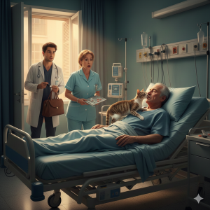 El camino al hospital parecía no tener fin. Cada semáforo en rojo era una eternidad. Se encontró pensando en cuándo fue la última vez que había visitado a su padre. Tres semanas, cuatro. Había perdido la cuenta. Cuando llegó al hospital, corrió por los pasillos vacíos hasta la habitación 312. La puerta estaba entreabierta y podía escuchar voces adentro. Respiró hondo antes de empujar la puerta. Lo que vio la dejó paralizada. Un gato, un gato atigrado, flaco, estaba acostado junto a su padre, ronroneando fuerte.