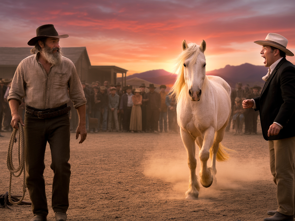 En el centro del pueblo, frente a la cantina La Serpiente, estaba don Mauricio Salazar, el hombre más rico de la región, un ranchero de rostro curtido y ojos fríos como el acero. Su sombrero de ala ancha proyectaba una sombra que parecía tragarse todo a su alrededor. A su lado, un caballo flaco de crines desgreñadas y mirada apagada resoplaba débilmente atado a un poste.