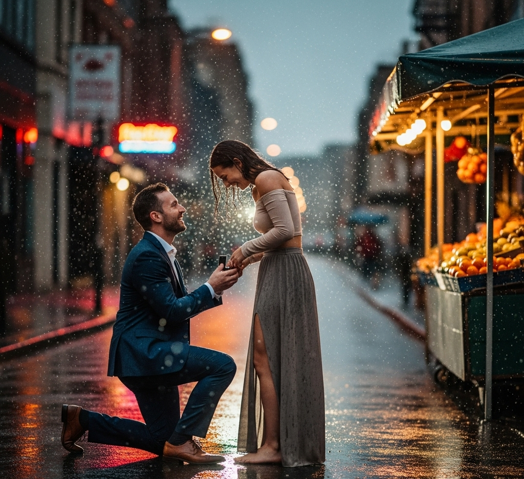 Un millonario le pidió que fingiera ser su novia por 5 minutos Lo que ella hizo lo dejó sin palabras Por favor solo necesito 5 minutos Santiago se arrodilló sobre el pavimento mojado sosteniendo una pequeña caja entre sus manos temblorosas Te pagaré lo que me pidas pero necesito que finjas ser mi