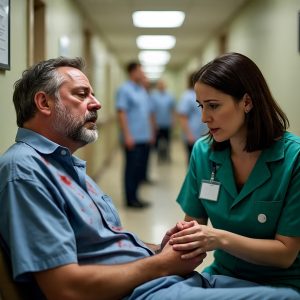 Emma pidió ayuda rápidamente y, junto con otra enfermera, lo llevaron adentro. De vuelta en urgencias, Emma le limpió las heridas, lo envolvió en una manta abrigada y le dio algo de beber. Él no dijo mucho, solo la miró con silenciosa gratitud.