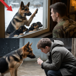 Jake se agachó lentamente con las rodillas crujiendo por el frío, una mano apoyada en la mermelada para mantener el equilibrio y la otra abierta con la palma hacia arriba, como si no pudiera ofrecer nada más que paz. La madre, una pastora alemana, no apartó la mirada de él. Sus ojos ámbar eran agudos, enrojecidos por el frío, y no gruñó, solo respiraba una niebla constante que se cernía entre ellos como humo.