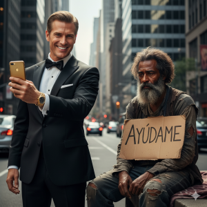 Su arrogancia era tan visible como su reloj Patekc Philip, que brillaba en su muñeca. Mientras Marcus discutía los detalles de su última adquisición corporativa, sus ojos se posaron en una figura que desentonaba completamente con el ambiente de lujo que lo rodeaba. Sentado en la entrada de un edificio corporativo estaba un hombre de aproximadamente 60 años con cabello gris despeinado y ropas gastadas que habían visto mejores días. Sus manos arrugadas sostenían un pequeño cartel de cartón que decía: “Cualquier ayuda es bienvenida.